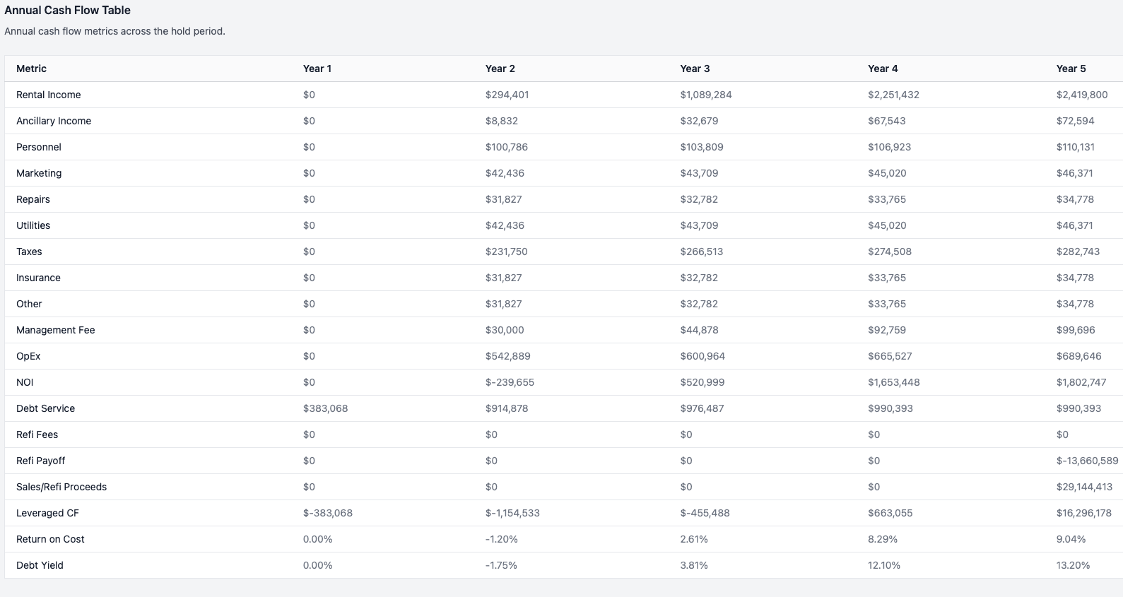 Easily calculate project level returns, debt yields, return on cost, DSCR and more.