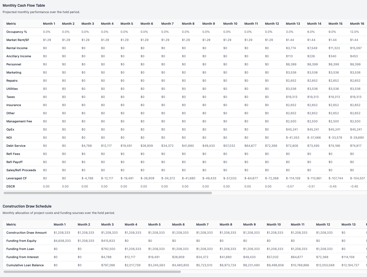 The model allows you to control rent and opex trends on a monthly basis, or use annual averages. Monthly cash flows show detailed occupancy ramps, while annual summaries provide high-level performance metrics.