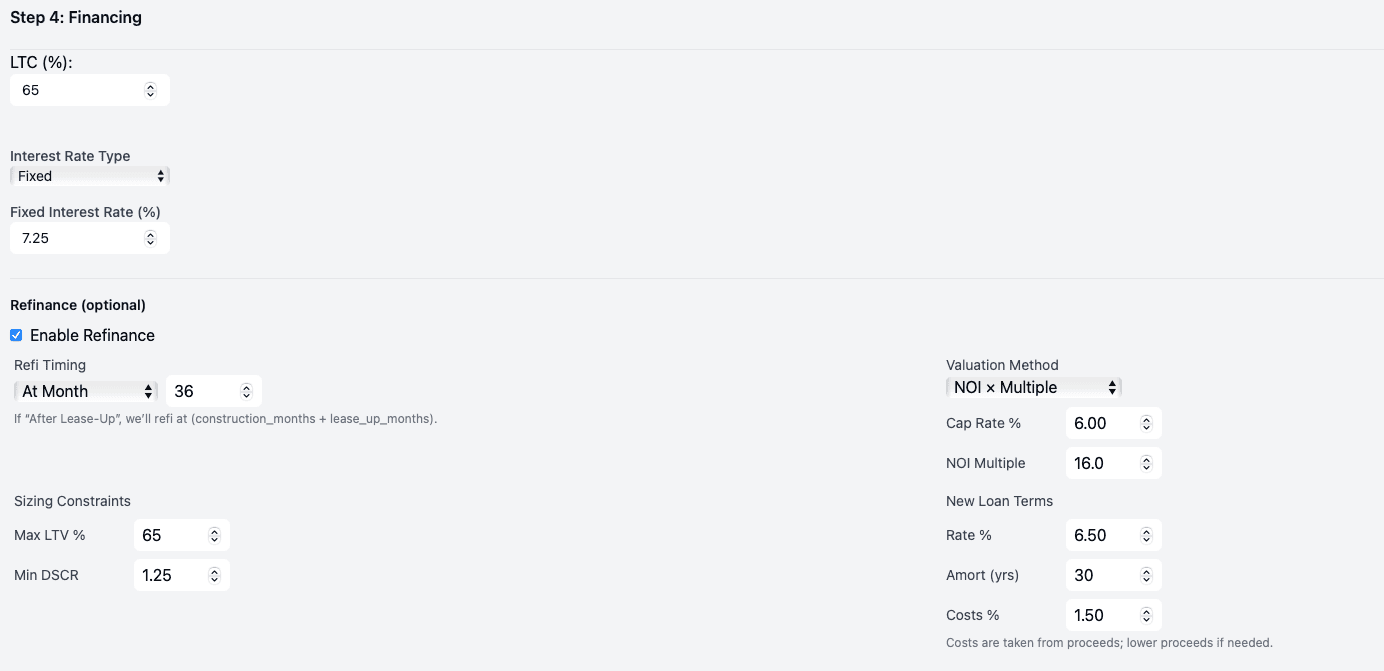 You can model refinancing based on either a specific month or after lease-up completion. The tool calculates new loan proceeds based on stabilized value using either cap rate or multiple valuation methods, with customizable LTV and DSCR constraints.