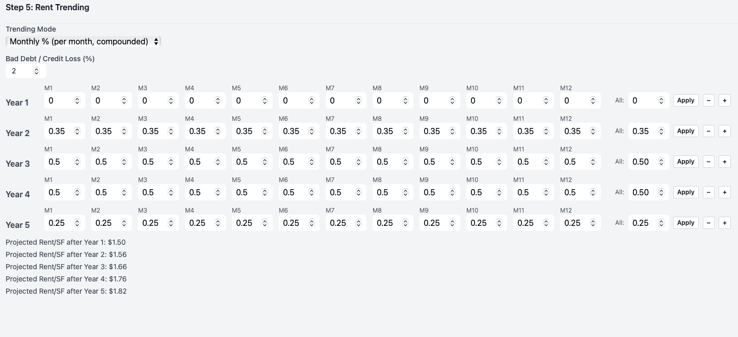 Grow rents annually or at the monthly level, trend expenses simply with one master rate, or get granular and trend each expense line item individually.